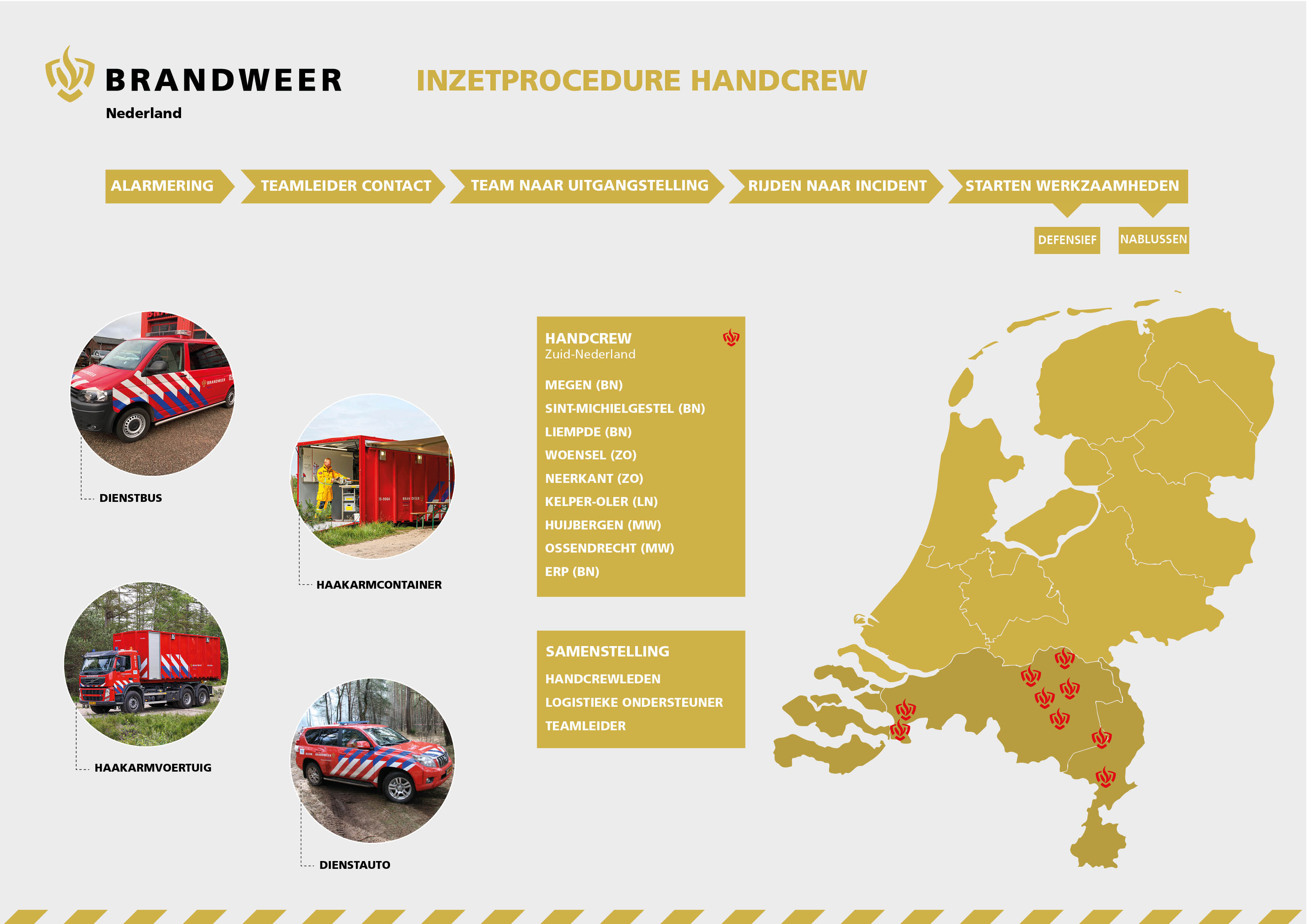 Zo’n 100 brandweermannen en -vrouwen uit de brandweerposten van Huijbergen, Ossendrecht, Megen, Sint-Michielsgestel, Liempde, Woensel, Neerkant en Kelpen-Oler zijn onderdeel van de Handcrew Zuid-Nederland. Ze zijn speciaal opgeleid en getraind voor natuurbrandbestrijding. Zij werken vaak onder zware omstandigheden en in moeilijk toegankelijke gebieden, waar reguliere brandweervoertuigen niet kunnen komen.