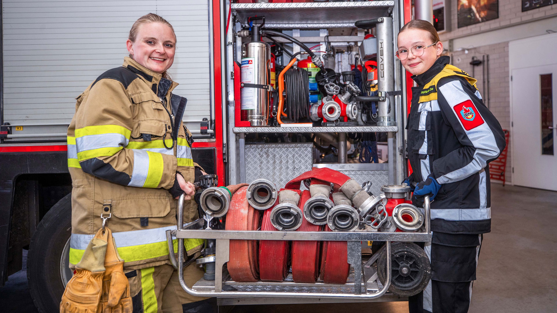 Zelf begon ze ook bij de jeugdbrandweer en stroomde meteen op haar achttiende door naar het volwassen korps. “Ik ben er alleen tijdens mijn zwangerschap tussenuit geweest, nu bijna twaalf jaar geleden. Ik was toen in onze regio de eerste vrouw en ze wisten niet meteen wat ze ermee moesten. Ik merkte het bij een uitruk. Ik liep bij een inzet de kaasfabriek in Culemborg in en kotste meteen een prullenbak onder van de lucht… Toen adviseerde een vrouwelijke bevelvoerder maar een zwangerschapstest te doen. Ik ben in overleg meteen van de uitruk gehaald. Maar ik ben wel elke oefenavond blijven komen op de kazerne, want anders werd ik gek op maandagavond thuis”, lacht ze.