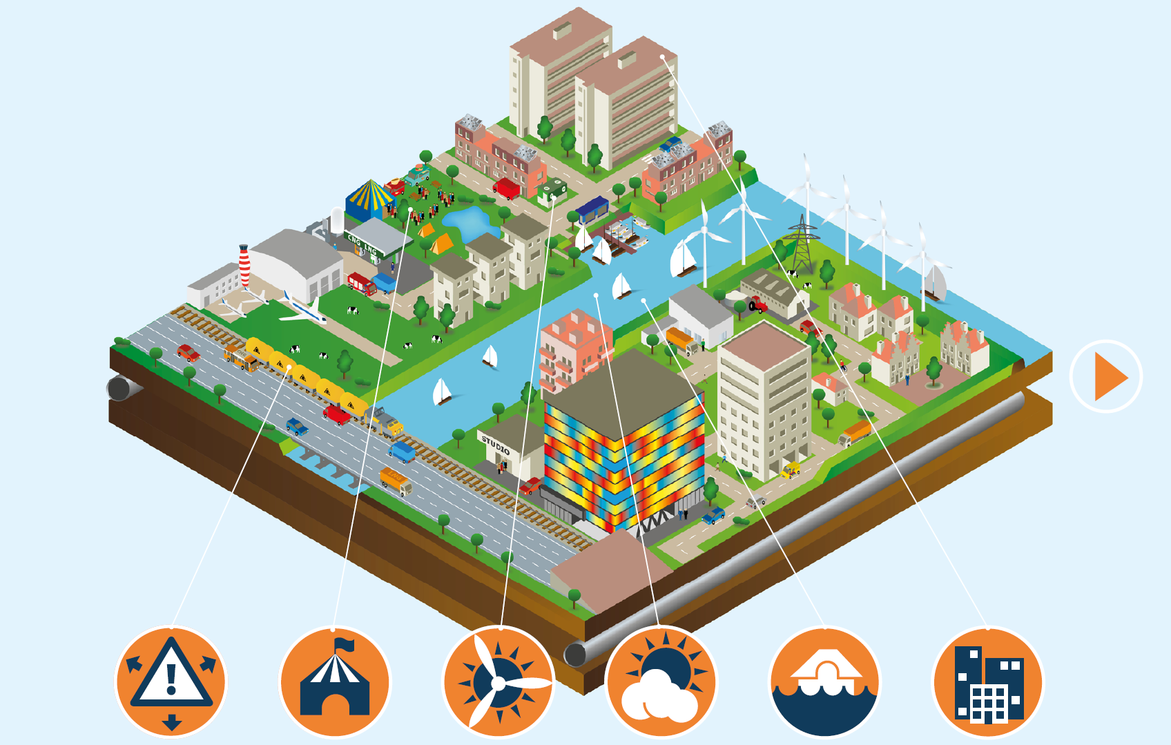 In de visie wordt ook ingezoomd op een zestal maatschappelijke thema’s. Dit zijn bekende thema’s – zoals externe veiligheid en evenementen – en nieuwe thema’s zoals energietransitie, klimaat en verdicht wonen. Door middel van praatplaten wordt ingezoomd op de raakvlakken tussen deze maatschappelijke opgave en het thema veilige leefomgeving. De genoemde onderwerpen zijn thema’s die de Veiligheidsregio’s Gooi en Vechtstreek en Flevoland regelmatig tegenkomen in de context van de omgevingsvisie. Natuurlijk zijn er nog meerdere thema’s waar een veilige leefomgeving raakvlakken mee heeft, bijvoorbeeld wonen en mobiliteit.