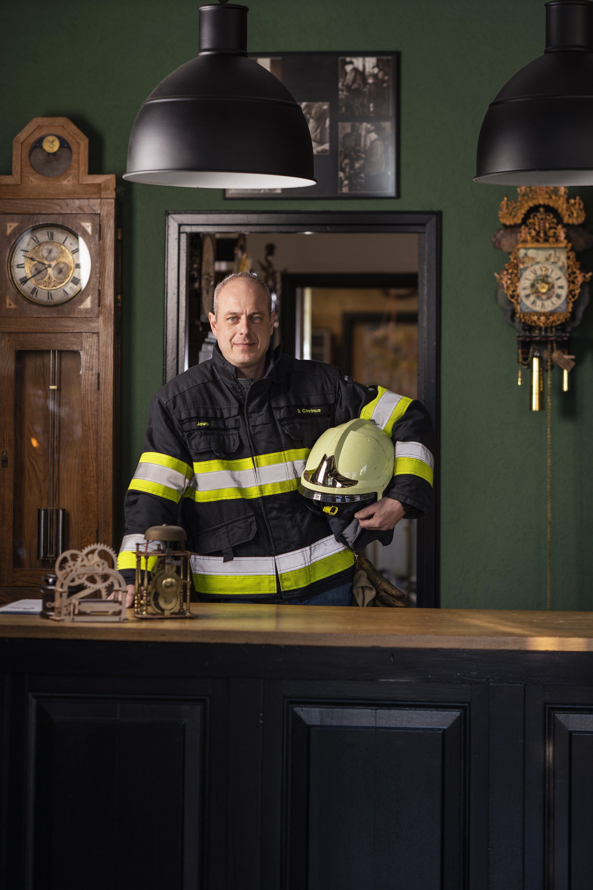 Hoe graag Dennis zijn vak ook uitoefent: als de pieper gaat, is hij weg. Sinds 2002 zit hij bij de Jouster brandweerploeg. ‘Ik ben weleens weggelopen terwijl er klanten in de winkel waren’, lacht hij. ‘Natuurlijk kan dat niet altijd. Maar ik laat niet gauw een uitruk schieten.’ Dennis is manschap en chauffeur/pompbediener. ‘Ik houd me graag bezig met materieel. Op dit moment ben ik leerwerkplekbegeleider voor twee collega’s die in opleiding zijn tot chauffeur/pompbediener. Lekker over techniek praten, kennis doorgeven, geweldig.’ Af en toe komen Dennis’ twee werelden samen. Bijvoorbeeld als hij een klok met brandschade repareert. ‘Bij een brand raken mensen zoveel kwijt. Dat heb ik vaak genoeg gezien. Dus als een klok dan bewaard blijft en ik weet ‘m in oude staat te herstellen, doet dat veel. Met de klant, maar ook met mij.’