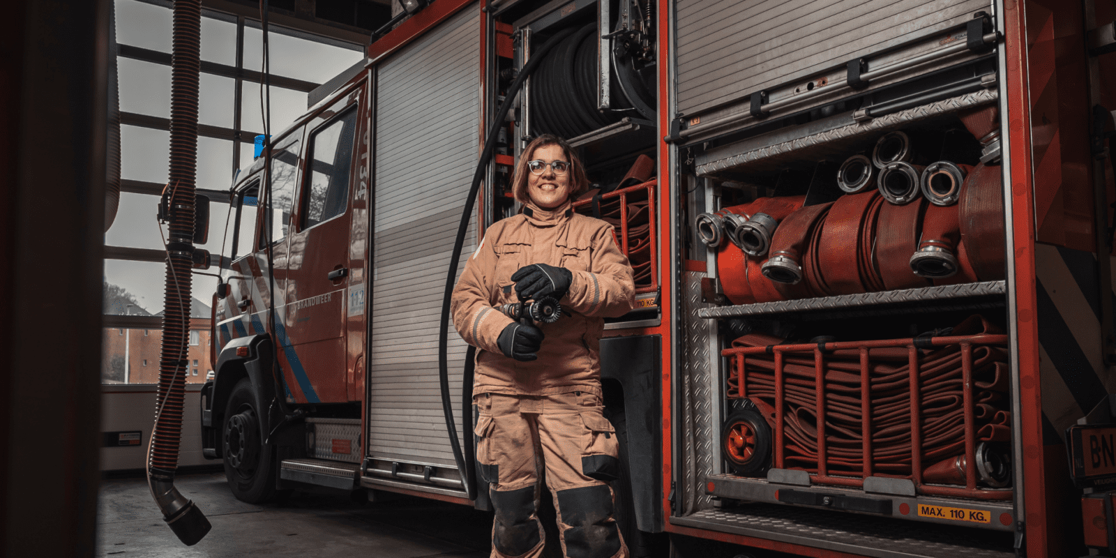 ‘Toen ik net bij de brandweer zat keken de mannen wel even van: hoe zit dat? Je bent als vrouw bij de brandweer toch in de minderheid, dus je valt op. Je bent anders. Maar als de anderen eenmaal doorhebben wat voor vlees ze in de kuip hebben, verandert de mindset. Verder is het gewoon zo dat je als vrouw fysiek minder sterk bent. Maar ik ben geen type dat snel zegt dat ik iets niet kan. De fysieke keuring is intensief. Ik ben iets kleiner, dus moet ik goed opletten bij het klimmen over het obstakel. Maar door de tunnels kruip ik dan wel weer makkelijker.’