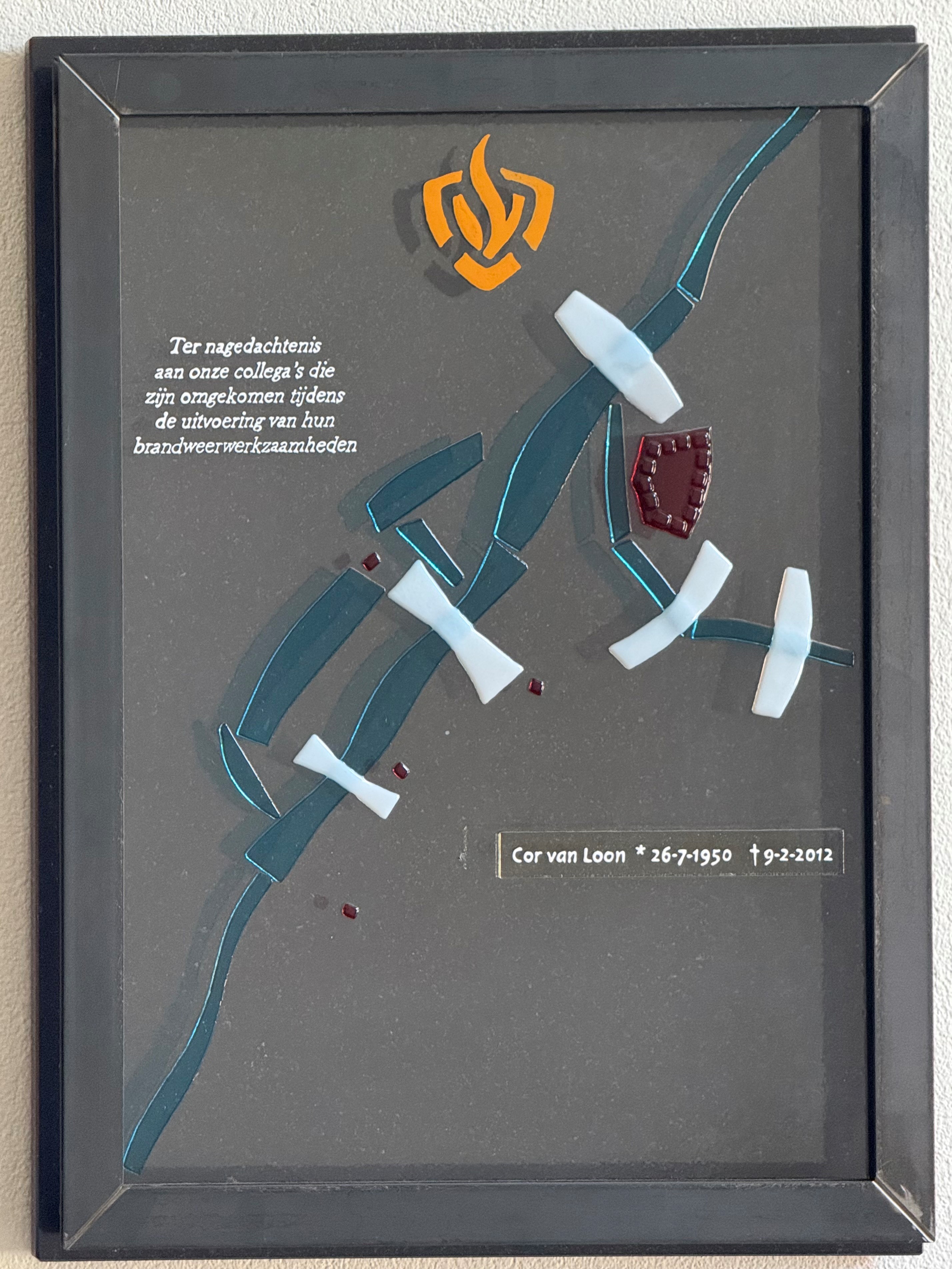 Op 9 februari 2012 overleed brandweercollega Cor van Loon aan de gevolgen van een ongeval dat plaatsvond tijdens een inzet op 28 mei 2000. Naar aanleiding van dit overlijden hebben enkele collega’s het initiatief genomen om een herdenkplaat te maken. Het ontwerp is door de collega’s gemaakt en de realisatie hiervan is begeleid door Wim Wanten van “Tiffany Shop Wim”, eveneens een oud brandweer collega.