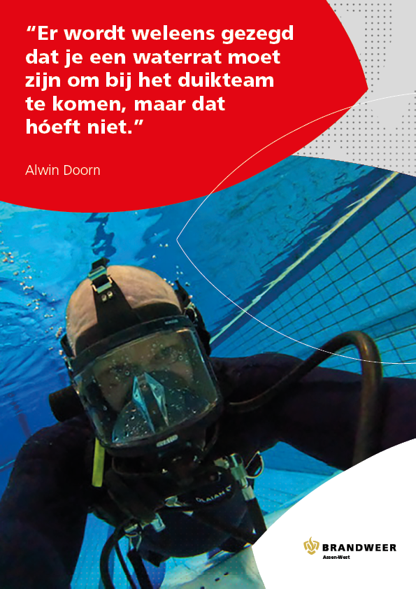 Doorn is gestart bij de brandweer in de Hofstad waar hij – toen hij in 1998 bij de brandweer in Den Haag kwam – een voorkeur voor specialisme mocht aangeven. ‘Mijn voorkeur was het specialisme brandweerduiken,’ en hij legt uit waarom dat was. ‘Brandweerduiken is uitdagend. Elke oefening is realistisch omdat je altijd in een – voor ons – niet natuurlijke en risicovolle omgeving aan het werk bent.’ Na zijn verhuizing terug naar Noord-Nederland werd Alwin enige tijd als duikinstructeur ingehuurd door de VRD. ‘Daar werd ik na verloop van tijd gevraagd om ook als vrijwillig brandweerduiker en duikploegleider bij de post Assen te komen. En dat deed ik.’