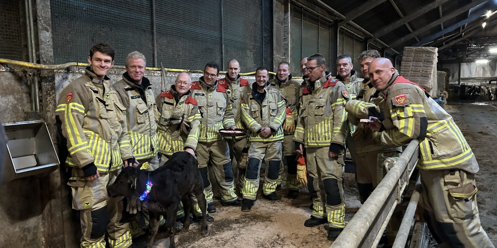 Fire zelf moest even loskomen. Ze had net gegeten en keek niet erg om naar alle drukte in de stal. Maar nadat ze door de boer op haar pootjes was gezet, leek ze de aandacht toch wel erg gezellig te vinden. Vooral de brandweerschoenen waren geliefd om aan te knabbelen.