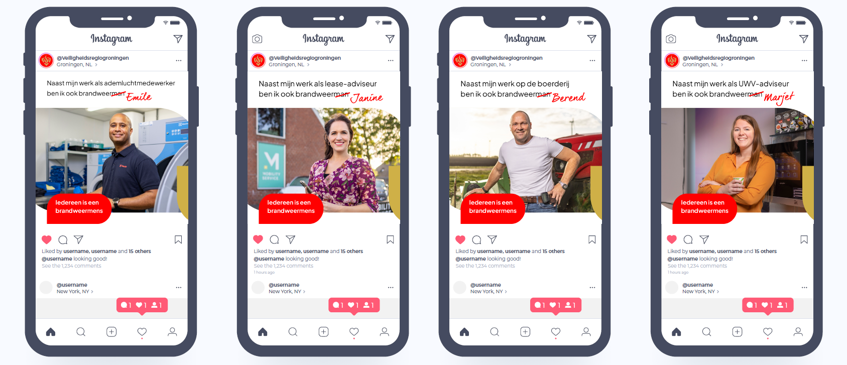 De insteek van de nieuwe campagne is dat de brandweervrijwilliger iemand is die klaarstaat voor de omgeving. Het maakt niet uit of het een man of vrouw is, het gaat om die persoon. Vandaar dat we een statement willen maken en het woord brandweerman hebben uitgelicht, met ‘man’ doorgestreept.