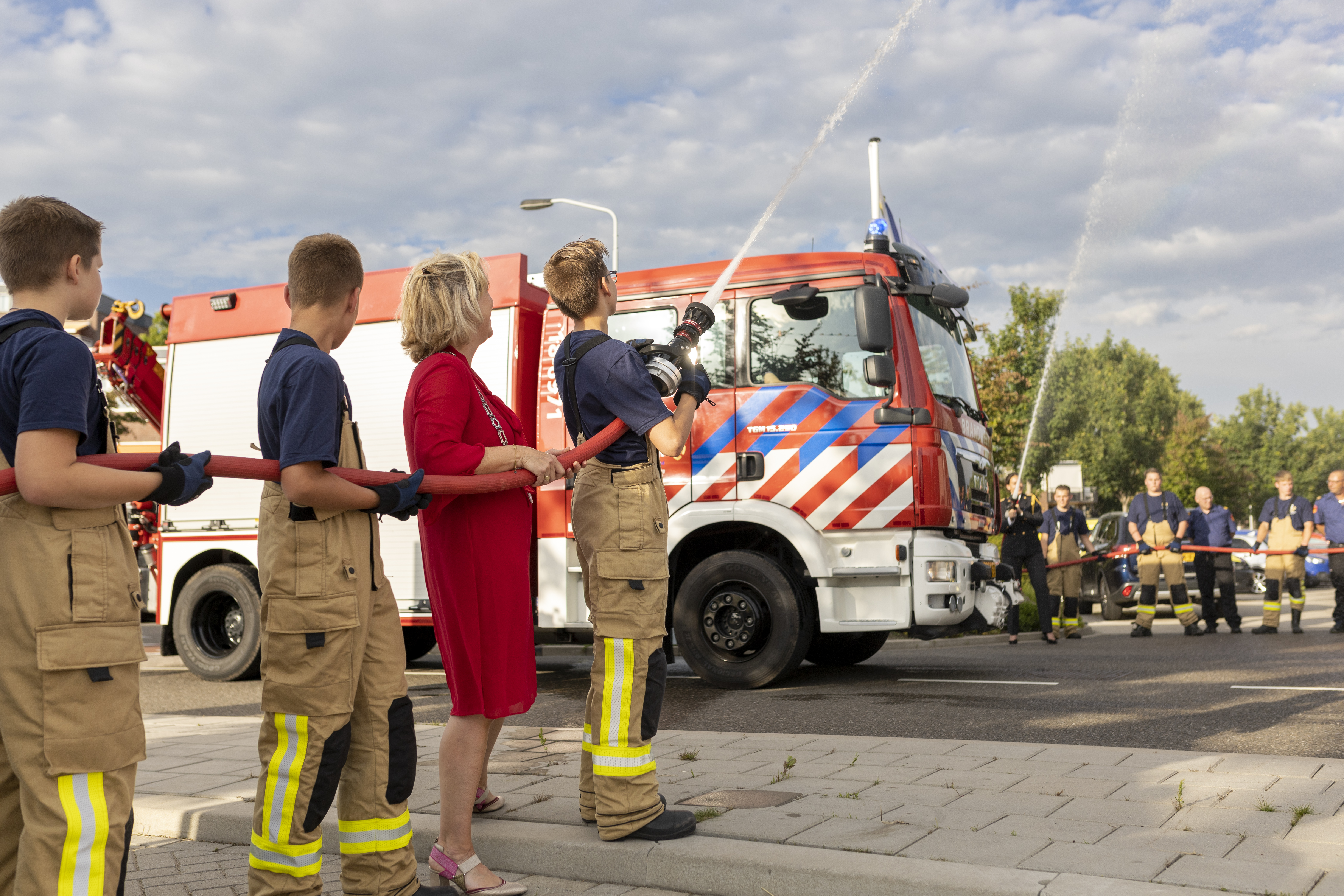 De jeugdbrandweer verwelkomt samen met burgemeester Jetten en brandweercommandant Frentz de aannemers en brandweervrijwilligers.