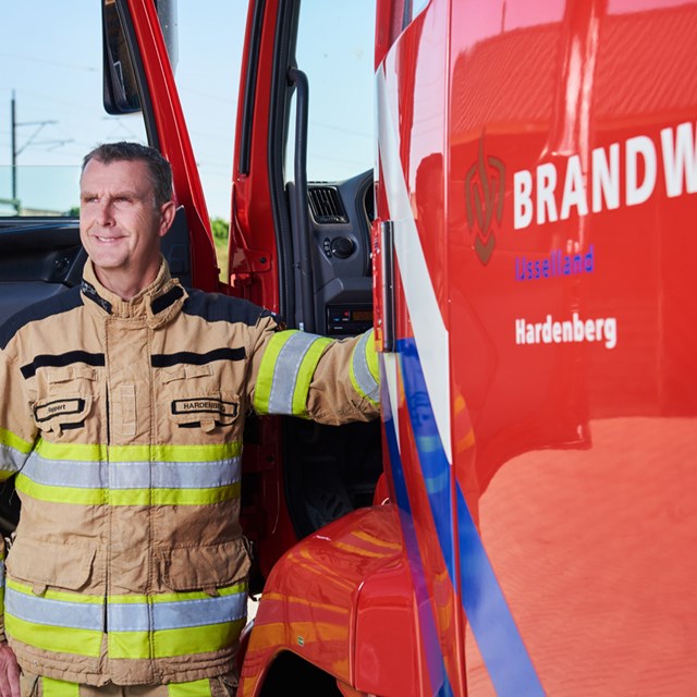 Marco Kappert is al zeventien jaar chauffeur bij Brandweer IJsselland. “Als ik achterin mijn voertuig kijk en ik zie dat de bemanning zich op zijn gemak voelt, weet ik dat ik mijn taak bekwaam en beheerst uitvoer. Dat geeft een enorme kick. Natuurlijk komt er stress bij kijken, maar door veel oefenen en ervaring in de praktijk krijg je die stress onder controle. Op onze post kan ik gelukkig veel oefenen, maar je moet wel zelf je ontwikkelpunten aangeven en die dan ook aanpakken. Want tijdens een uitruk ben jij de eerste die in actie moet komen en dat is een hele verantwoordelijkheid. Dan moet je er staan. In feite ben je de levensverzekering van de bemanning. De bijscholing, daar kijk ik wel naar uit. Ik ben inmiddels 17 jaar chauffeur, maar ook ik kan nog steeds leren en mezelf verbeteren.”