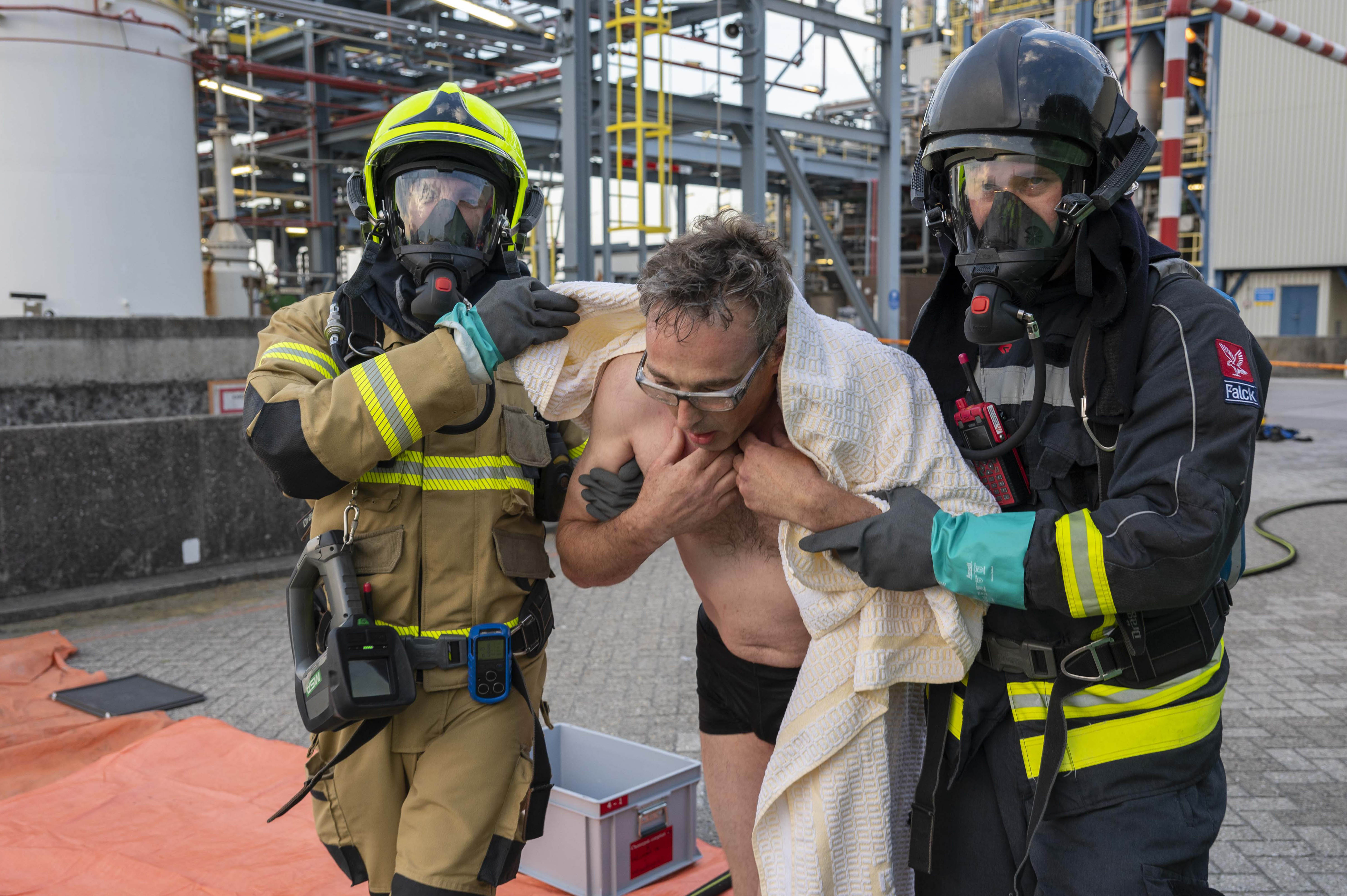Terug naar de oefening: vlak na de melding is vastgesteld dat er twee personen vermist zijn. Daarom moet worden opgeschaald en moet ook Brandweer Delfzijl ter plaatse komen. Intussen is op Chemie Park Delfzijl de eerste eenheid van Falck gearriveerd. Na overleg gaan twee brandweermannen op verkenning met de juiste persoonlijke beschermingsmiddelen (PBM) op de plaats van het incident, om het lek te dichten. Een paar minuten later is ook de ploeg uit Delfzijl ter plaatse.