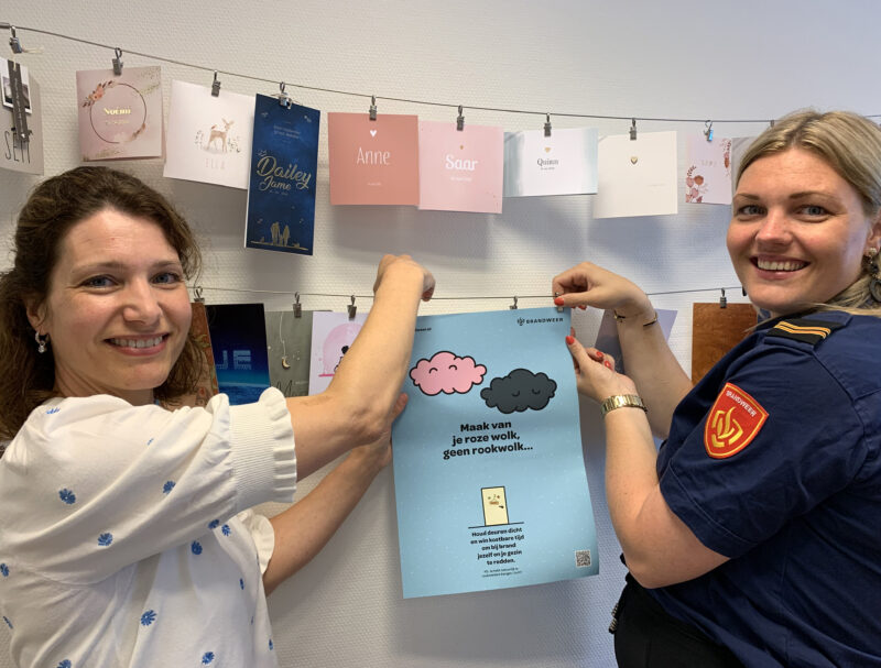 Terwijl verloskundige Suzanne Bekke van verloskundigenpraktijk beWonder in Wierden haar voorbereidingen treft voor een echo, dwalen de blikken van de aanstaande ouders af naar de poster. ‘Maak van je roze wolk geen rookwolk’, leest de man hardop. En niet veel later: ‘Houd deuren dicht…‘, klinkt het. Dan lachend: ‘Deur dicht!’, dat zullen we later vast en zeker vaker zeggen tegen ons kind.’ Hij zegt het met een knipoog, maar de onderliggende boodschap is overgekomen. Een dichte binnendeur, zoals die van de kinderkamer, redt levens als er brand uitbreekt. Ook het ophangen van rookmelders en het maken van een vluchtplan zijn tips die de brandweer meegeeft.