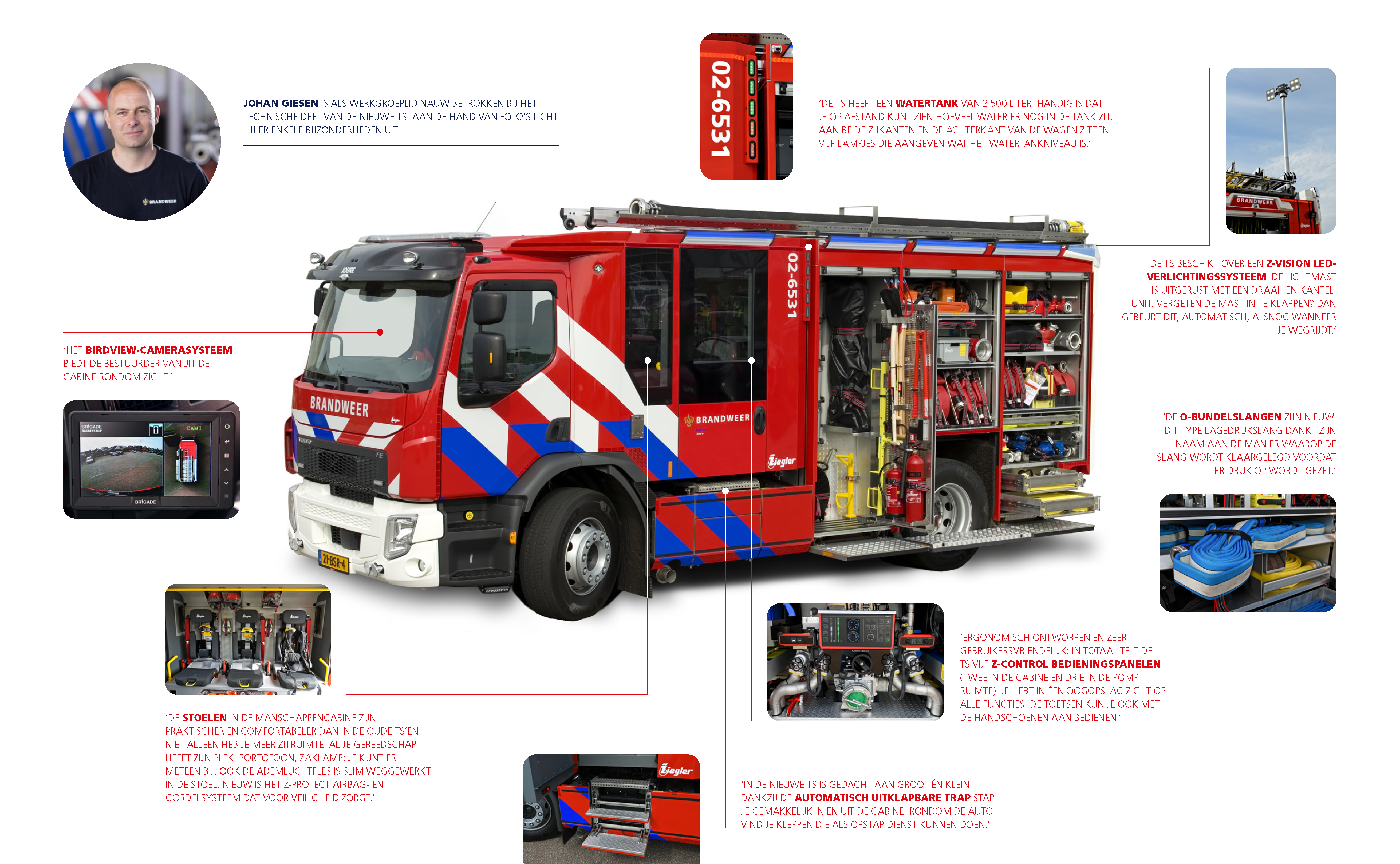 Het verschil tussen de nieuwe en de oude voertuigen? Piet: ‘Nou, dat is hetzelfde als wanneer je het mobiele telefoontje uit 2006 naast de smartphone van nu legt: weinig is hetzelfde gebleven. Wat opvalt? De veel ruimere cabine voor de manschappen, de zeven zitplaatsen (2+2+3) en het pompsysteem. Daarnaast heeft de nieuwe TS innovaties die je nergens anders vindt in Nederland: het ALPAS3-bepakkingssysteem en het Z-control bedieningspaneel. Echt het nieuwste van het nieuwste.’