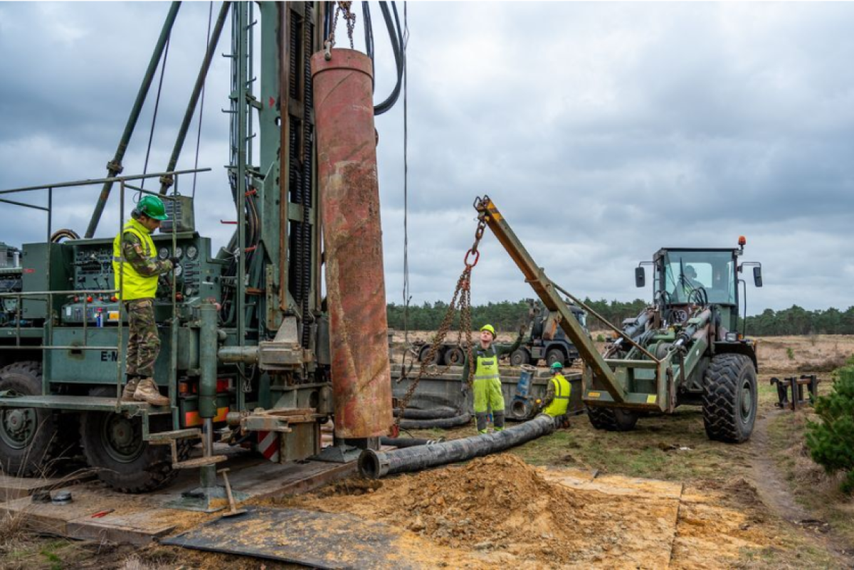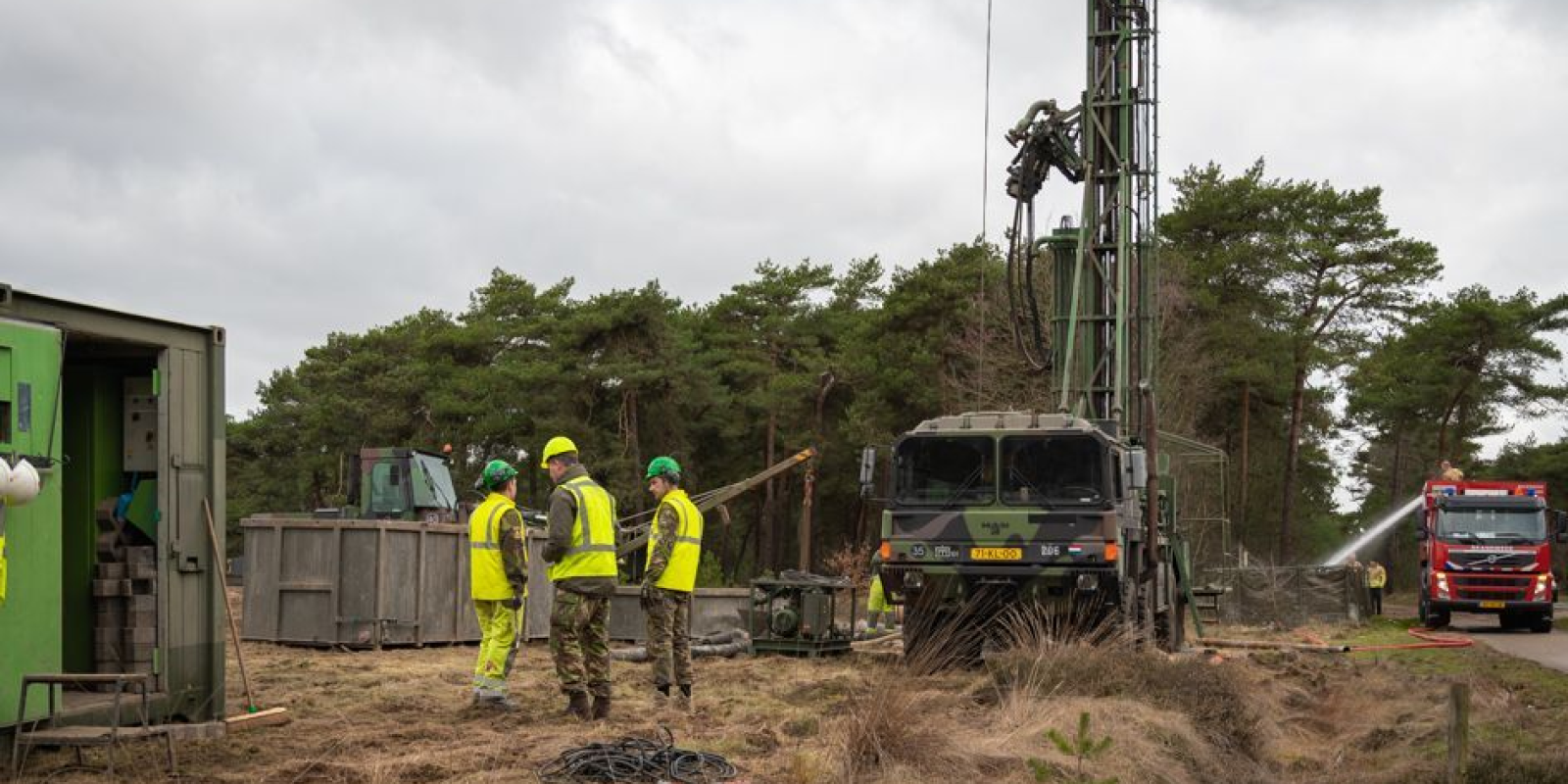 Commandant Perry van 101 Geniebataljon vertelt enthousiast dat de militairen samen met brandweercollega’s, deze week zijn begonnen met het boren van drie calamiteitenputten op de Weerter- en Budelerbergen. Deze putten zorgen ervoor dat de brandweer meer bluswater heeft om een brand in een droog natuurgebied snel onder controle te krijgen. “Het boren van de putten is een heel karwei, maar daarom niet minder leuk. Deze militairen werken de komende tijd dag en nacht door om de klus te klaren. Over twee weken moeten de drie nieuwe waterputten klaar zijn.”