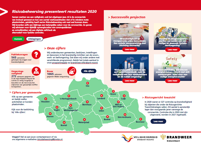 In ons werk ondersteunen wij gemeenten, bedrijven, instellingen en bewoners in het brandveilig inrichten van de woon-, werk- en leefomgeving. Daar gaan we in 2021 mee verder! Sommige controles worden ingehaald en we bereiden ons voor op de komst van de Omgevingswet per 1 januari 2022.