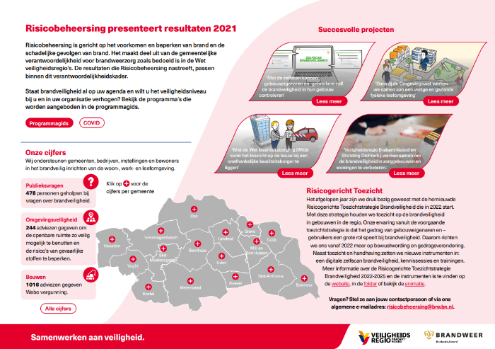 Zo hebben we dankzij de inzet van de digitale zelfscan brandveiligheid zicht kunnen houden op de brandveiligheid in de regio Brabant-Noord, ook als we niet langs konden gaan voor een brandveiligheidscontrole. Daarnaast bereiden we ons intensief voor op de komst van de Omgevingswet aan de hand van het programma Omgevingswet.