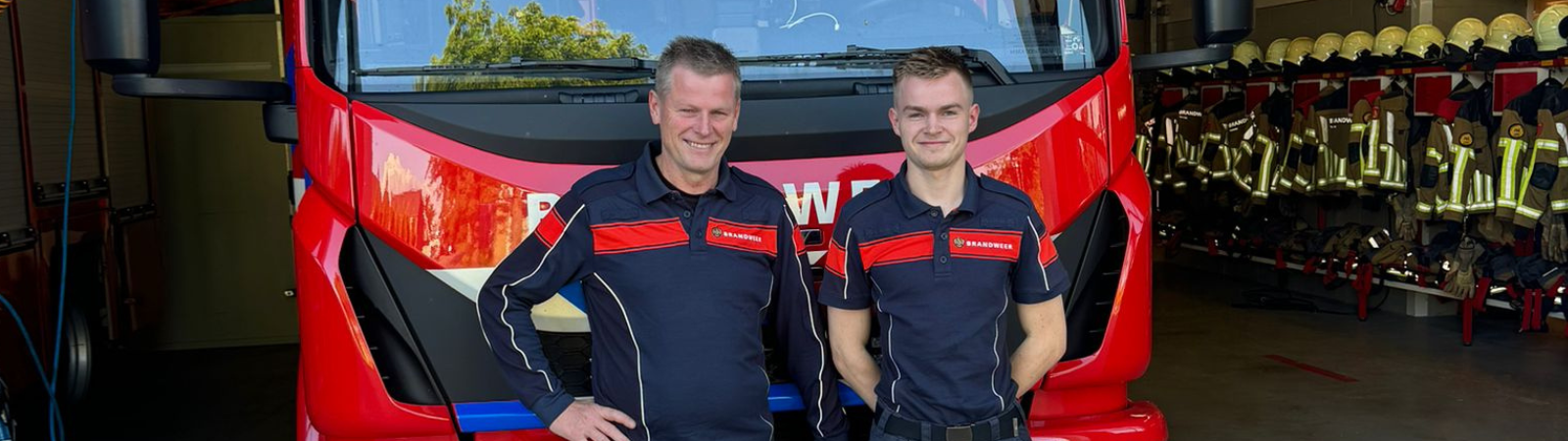 Erwin (58) is al 28 jaar een vertrouwd gezicht bij de brandweerkazerne in Markelo. Zijn zoon Jeroen (25) is vorig jaar gestart als aspirant. Samen werken ze op het familie melkveebedrijf, maar de brandweer is en blijft altijd een passie. “Bij de brandweer leer je veel mensen kennen en kom je overal” vertelt Erwin. Voor Jeroen was de keuze om brandweervrijwilliger te worden vanzelfsprekend. “Ik ben opgegroeid met de verhalen van mijn vader. Zijn enthousiasme over het brandweervak hebben me altijd nieuwsgierig gemaakt.”