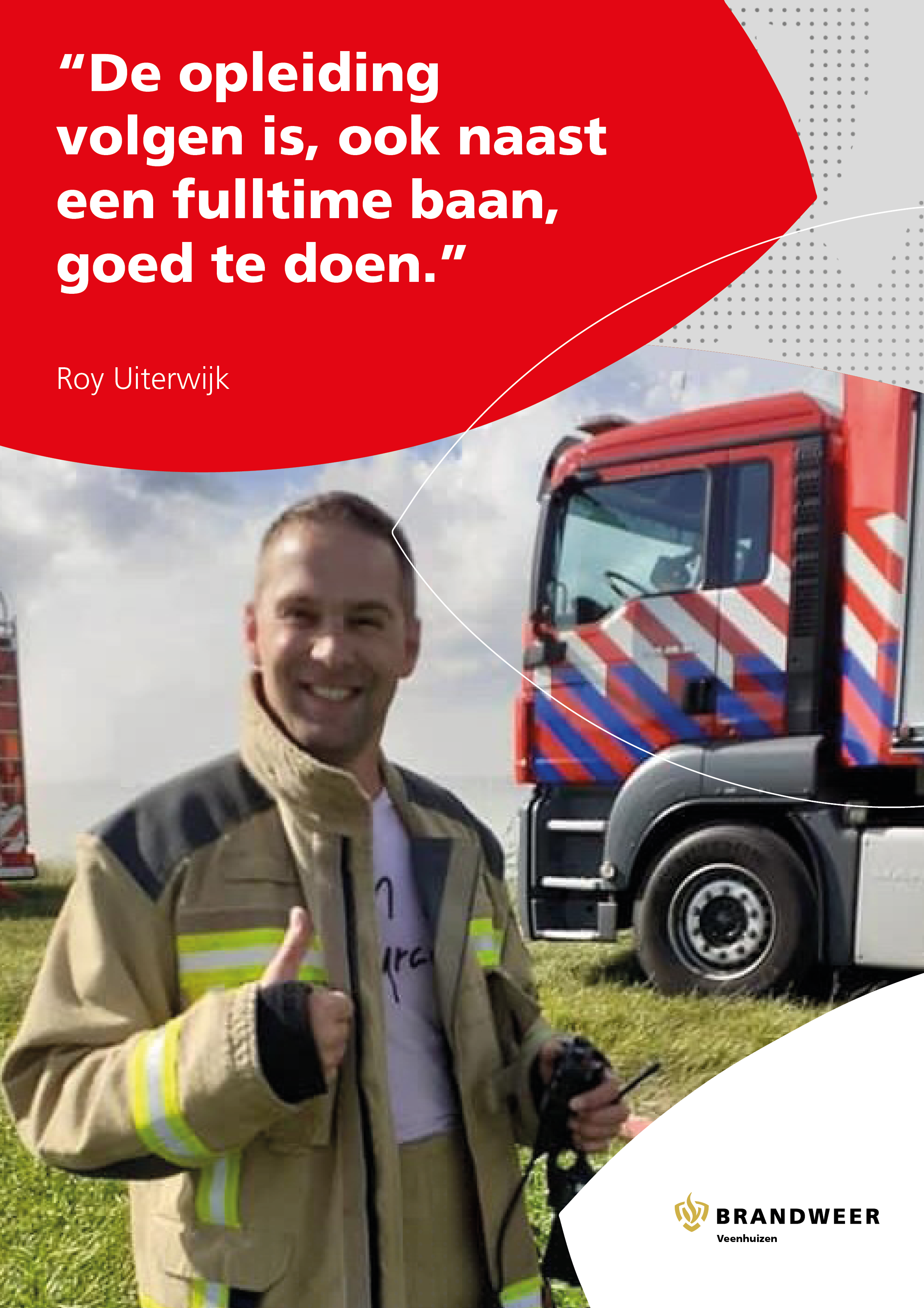 ‘Als klein jongetje was ik al gecharmeerd van het brandweervak’, vertelt Uiterwijk, ‘Als er dan zo’n rode auto door de straat kwam rijden, stond ik met open mond te kijken. En als de sirene en de zwaailamp dan ook nog aangingen, kon mijn dag niet meer stuk.’ Inmiddels bevindt Roy zich regelmatig ín het voertuig waarvan hij eerder droomde, en herkent hij zichzelf in de kinderen die gefascineerd staan kijken wanneer een brandweerauto passeert. ‘Omdat de afstand tussen mijn werk- en woonplaats groot is, dacht ik dat het brandweer vak voor mij geen optie zou zijn’, vertelt Roy verder, ‘Maar al vrij snel kreeg ik door dat je prima bij de vrijwillige brandweer werkzaam kunt zijn ondanks dat je overdag niet altijd inzetbaar bent. Het liefst ben je natuurlijk vaak beschikbaar maar laten werk of privé dat bij een melding niet toe, dan is die ruimte er ook.’