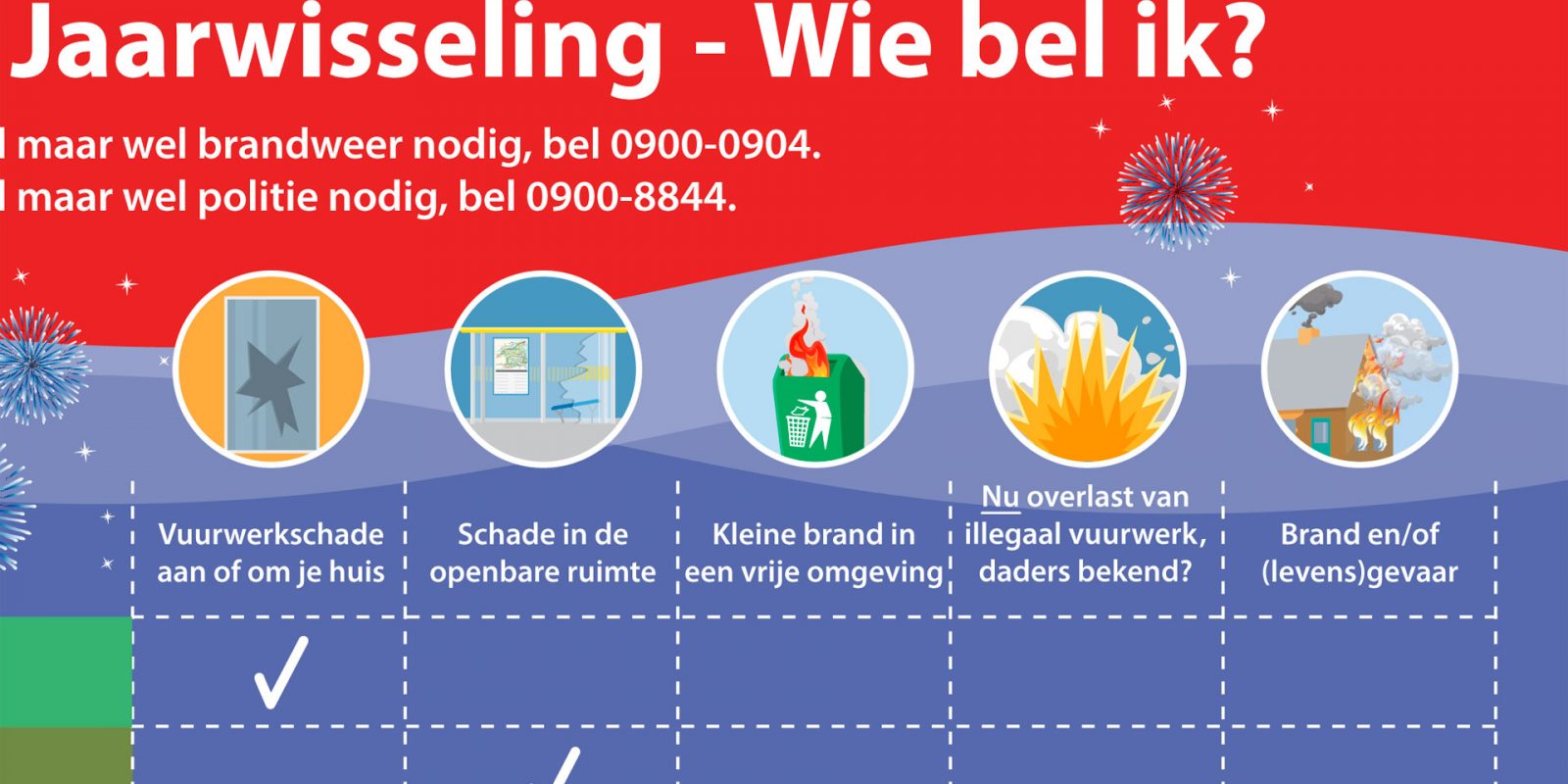 Om ervoor te zorgen dat 112 bereikbaar blijft voor mensen in een noodsituatie is het goed om te weten wie je waarvoor belt. Voorgaande jaarwisselingen gingen veel meldingen bij de meldkamer over kleine brandjes op straat of andere zaken die weliswaar overlast kunnen geven, maar geen acuut (levens)gevaar, schade of letsel opleveren. De verschillende soorten meldingen zijn in een overzicht in beeld gebracht. Hiermee bieden de gezamenlijke hulpdiensten duidelijkheid over wie je in welke situatie belt.