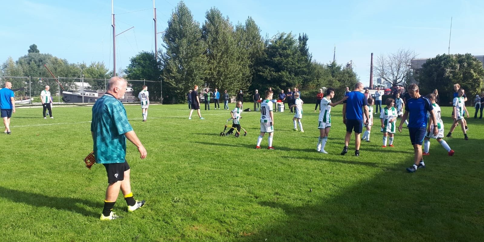 Oud-voetballer Henk de Haan was gevraagd scheidsrechter te zijn, en dat deed hij met veel plezier. ‘Wat een happening! Prachtig weer, en het was mooi dat iedereen van tevoren het volkslied zong. Iedereen straalde van oor tot oor. Het was een eer om hier te fluiten – of eigenlijk te toeteren, want ik kon mijn fluitje niet vinden.’ De Haan was onder de indruk van het Kids United-team: ’19-5, dat is natuurlijk een ongekende uitslag! Zo’n grote nederlaag heeft de brandweer nog nooit geleden. Heel knap van Kids United!’