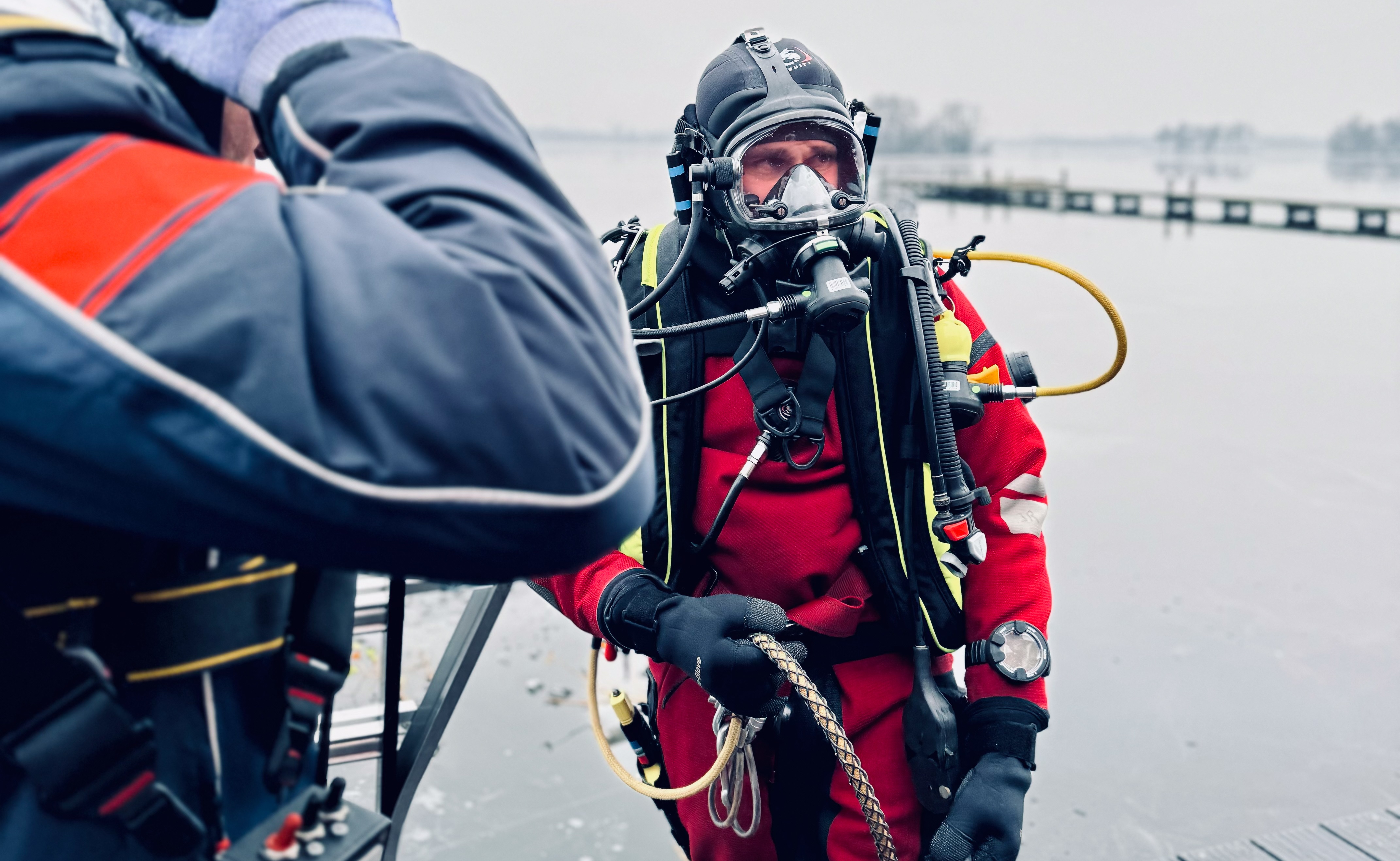 Tot slot: wat moet je doen als je door het ijs zakt? Arjan: “Probeer rustig te blijven en roep om hulp. Breek het ijs af tot het sterkste stuk en rol op het ijs.” En als dat allemaal niet lukt, is het fijn om te weten dat er geoefende duikers paraat staan om je te redden.