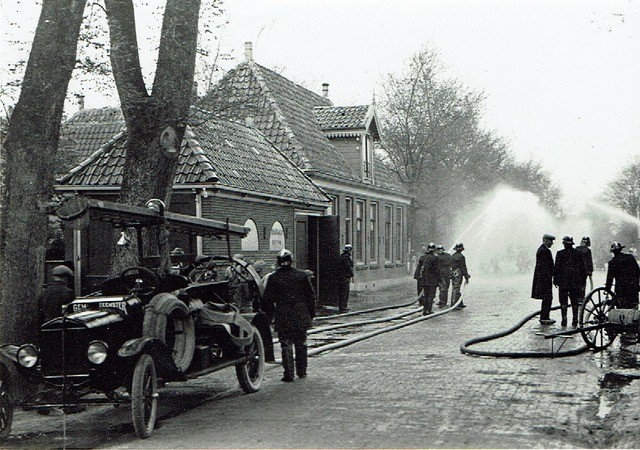 “Tot 1924 was er in gemeente Beemster een zogenaamde ‘plichtsbrandweer’. Een plichtsbrandweer houdt in dat uit ieder gezin één man werd aangewezen om te helpen bij de brandbestrijding. Dit was een systeem dat al vanaf 1750 werd gehandhaafd. Toentertijd werd er nog met ‘handspuiten’ gewerkt. Voor de bediening van één zo’n voertuig was wel 36 mannen nodig. Je moest elkaar namelijk na een kwartier al aflossen, omdat het pompen met het voertuig zoveel kracht kostte.