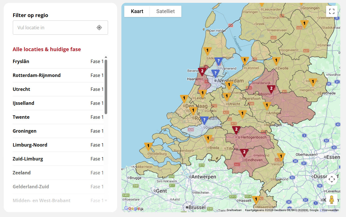 Op de website vind je een kaart van Nederland, met per veiligheidsregio aangegeven in welke fase die regio zich bevindt.